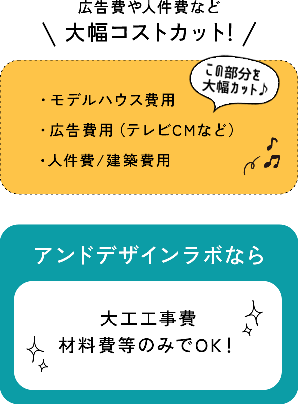「高い性能とデザイン性のある家が欲しい。でも、費用は抑えたい。」そんなお客様の切実な願いをアンドデザインラボは叶えます。高額な広告費をかけず、徹底したコスト管理と業界トップクラスの効率的な家づくりを追求。