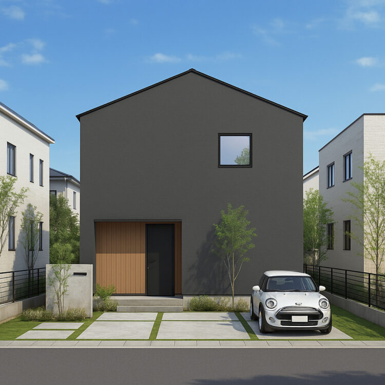 すっきりとしたシルエットに、落ち着いたトーンの外壁が印象的な外観。玄関まわりには木目を取り入れ、あたたかみも感じさせます。