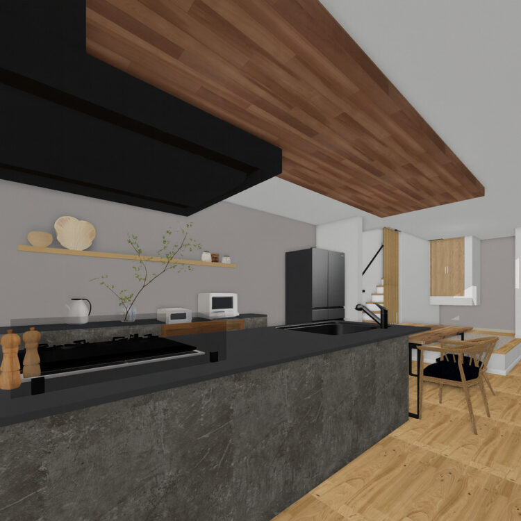 重厚感のあるグレーのキッチンと、木目の天井が温もりを添えるLDK。料理をしながら家族の様子が見渡せる開放的な間取りです。奥には小上がりスペースもあり、食事やくつろぎ、家事の合間の休憩にも活用できます。
