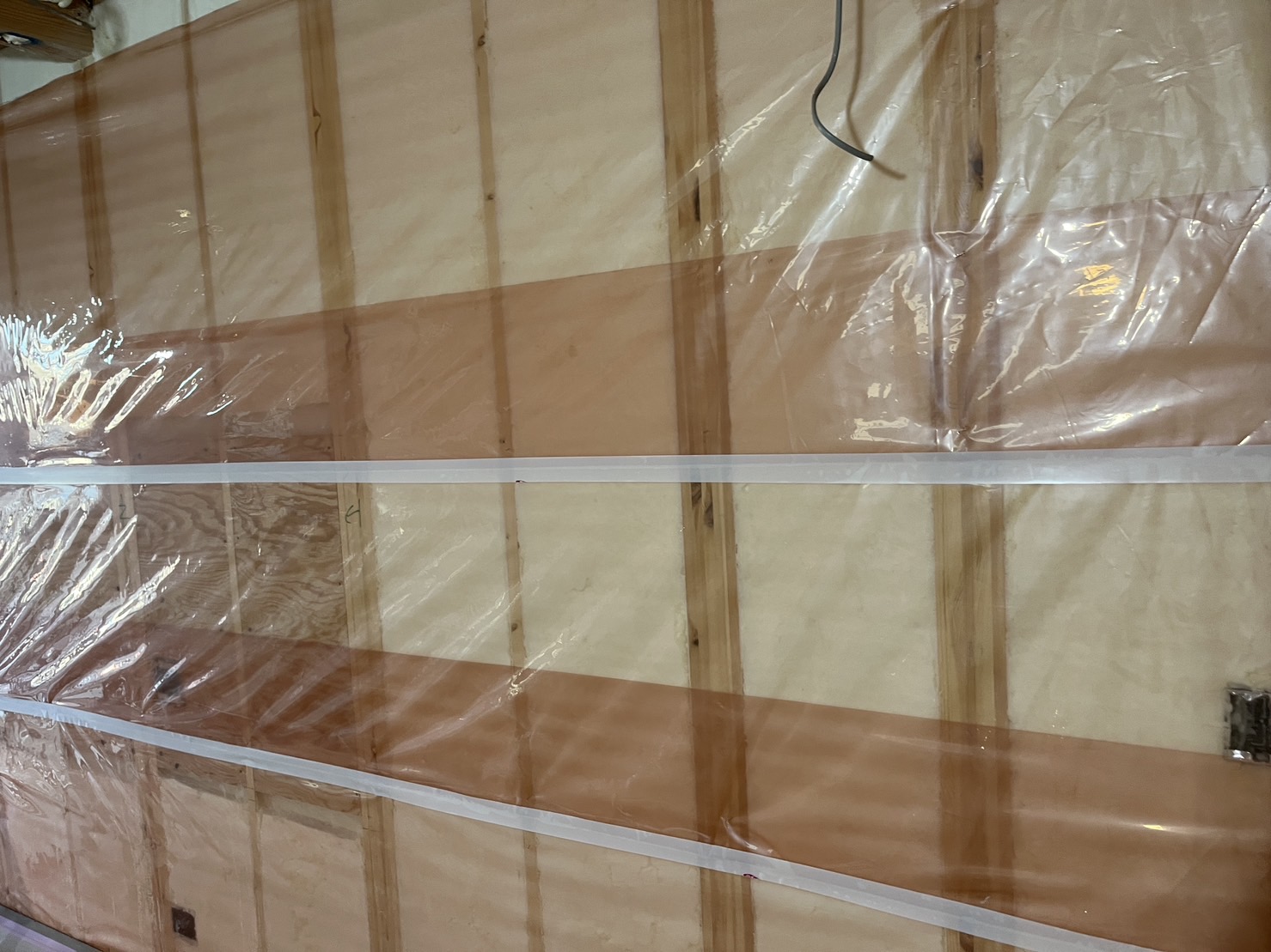 吹付や、グラスウールなど断熱材を施工した後にその上からべーパーバリアを張っていきます。その上に石膏ボードを張ります。普段の工程にひと手間加える工事になります。