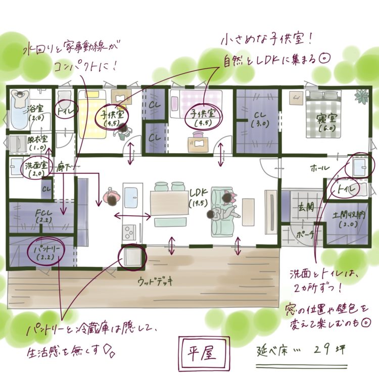 延床25~30坪というと家が狭い印象を受けがちですが、2階建てには必要でも平屋には必要ないスペースがあるため、