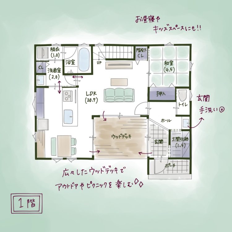 あまり面積に余裕のない中で、和室や土間 収納などをきっちりと組み込みました。