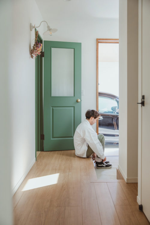 ガラスが入ったデザインの開き戸は開放感があり、空間に奥行き感も生まれます。