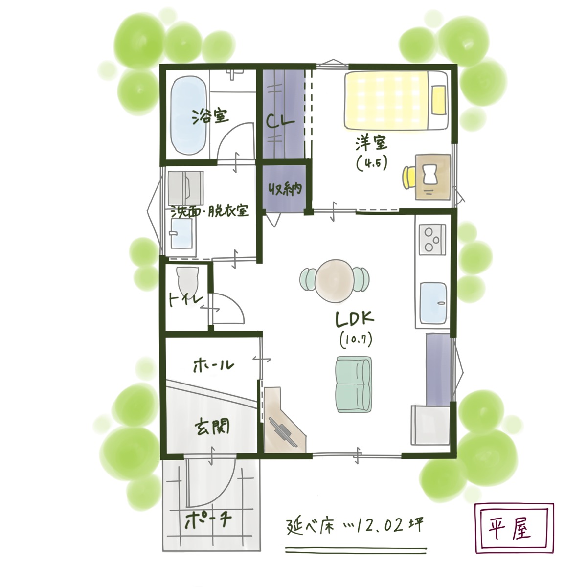 この平屋の住まいは、延べ床面積12.02坪というコンパクトなサイズでありながら、機能的で快適な暮らしを実現します。