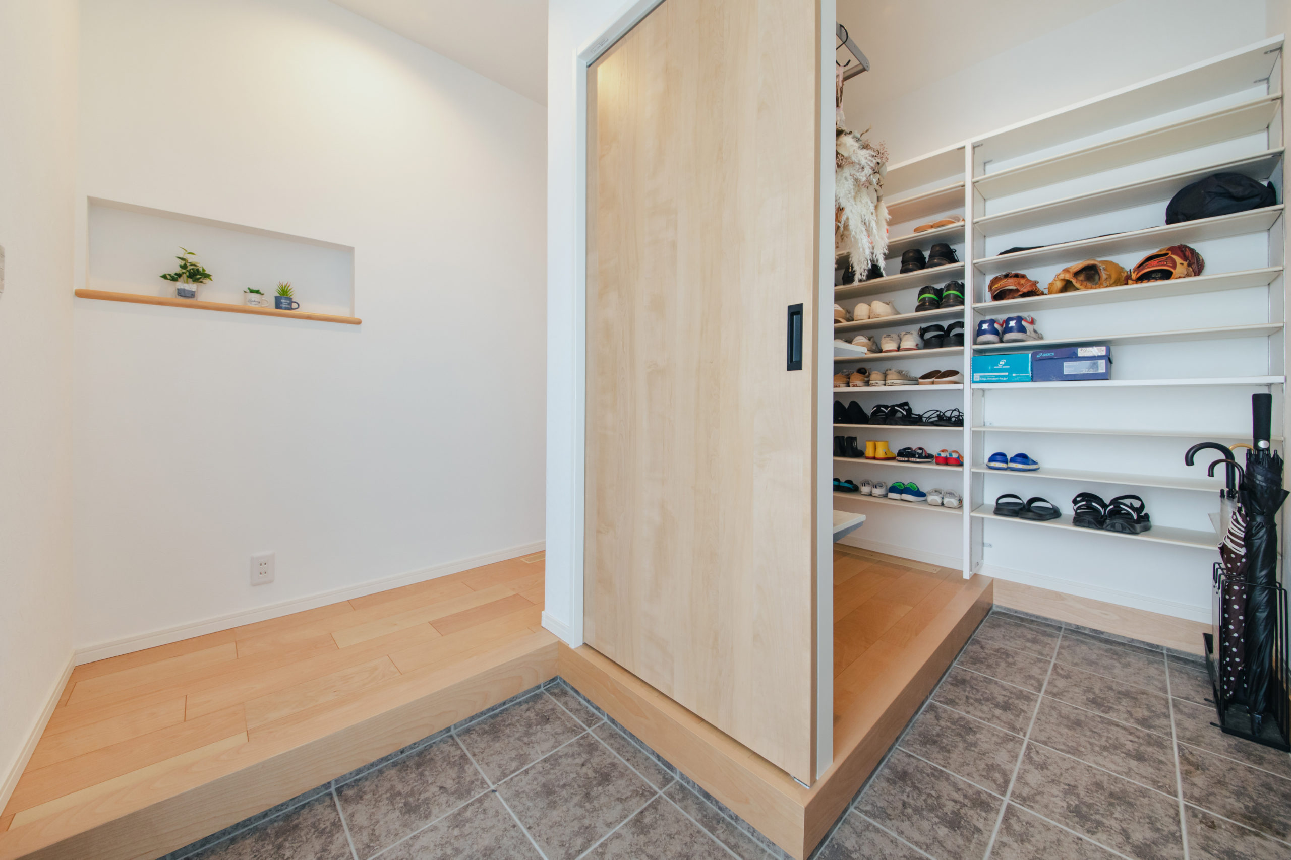 収納の種類も、完全にカスタマイズ可能。靴やコート類はもちろん、アウトドアギアや子どもの遊び道具まで、家族の持ち物に合わせた収納プランを実現できます。市販の下駄箱では収まりきらないブーツや長靴も、オリジナルの収納スペースなら問題なくしまえます。