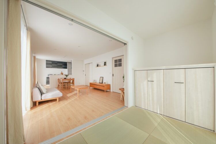 - 和室のスタディカウンターは、落ち着く空間に: LDKの隣には4.5帖の和室が設けられています。LDKとの境を開放すれば一体的に使え、扉を閉めれば独立した空間として利用できます。特に、和室に設けられたスタディカウンターは、お子様の宿題や大人のちょっとした作業を集中できる落ち着いた空間です。来客時には客間としても使え、多目的に活用できます。