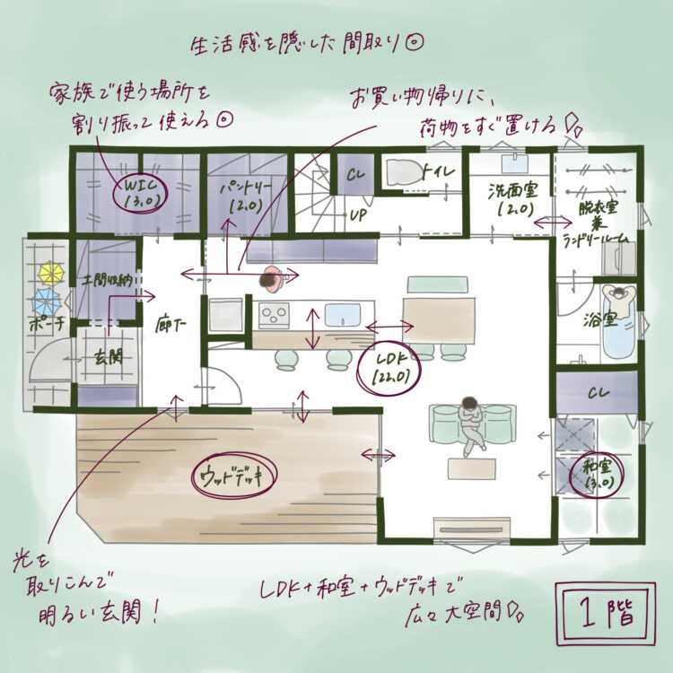 この間取りの最大の魅力は、22.0帖の広々としたLDKです。リビングに隣接した和室とウッドデッキを合わせることで、さらに開放的な大空間が生まれます。家族でゆったりとくつろいだり、友人を招いてホームパーティーを開いたりと、多様な使い方が可能です。和室は扉で仕切ることができるので、急な来客時には個室としても使えて便利です。