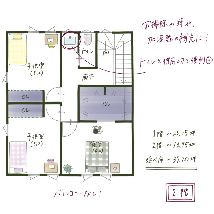 二階には、主寝室と二つの子ども部屋、そして家族共有の収納スペースを設けました。主寝室の隣にある納戸は、季節物などかさばるものをまとめて収納するのに便利です。また、二階の廊下にも洗面台を配置。掃除の時や加湿器への給水など、ちょっとした作業に使えるので、とても便利です。