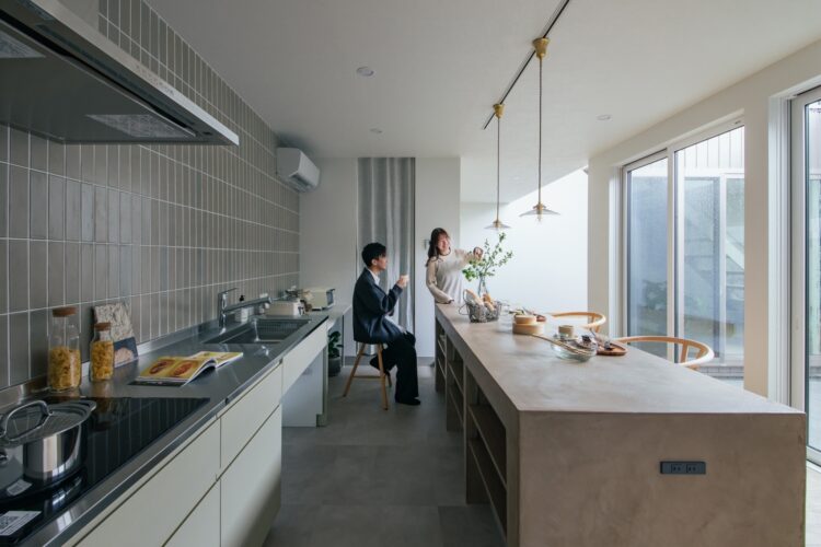 LDKの中心にアイランドキッチンを配置し、隣接して木製のカウンターを設けます。