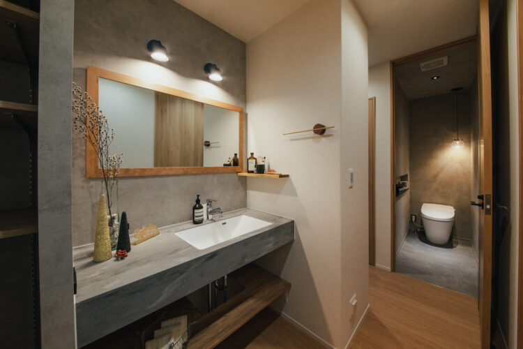 洗面・脱衣室収納: タオルや洗剤のストックに便利な棚を完備。