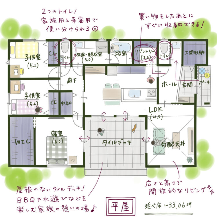 「30坪台の平屋にトイレは1つ」が一般的ですが、この間取りにはなんとトイレが2つあります。