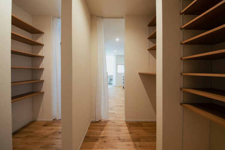デザインだけでなく、家事のしやすさも抜群です。 キッチン横からパントリー、脱衣室、洗面室、FCL(ファミリークローゼット)へと繋がる動線は、行き止まりのない回遊動線になっています。