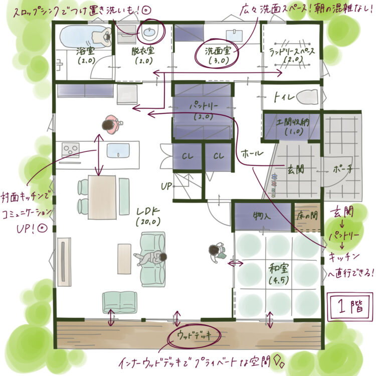 この配置は、家事をしながら家族時間を削らない間取りです。