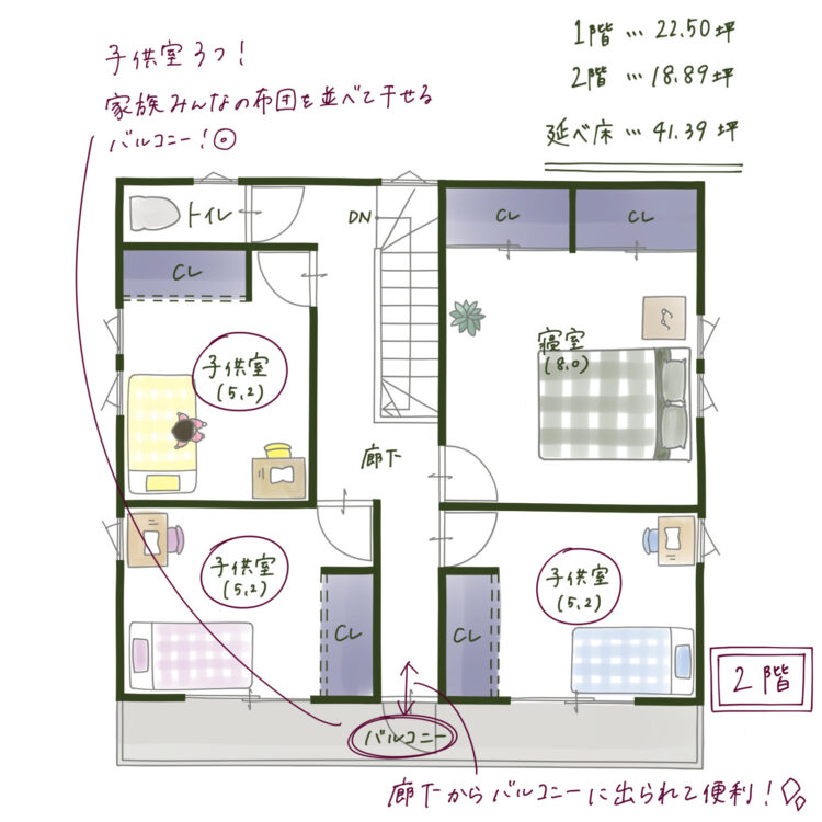 ⑤ 2階は「子ども3人」+「家族布団干し」に対応