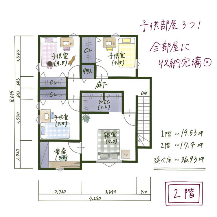 全部屋に収納完備+書斎: 2階には4.5帖の子供部屋を3つ、7.0帖の寝室を配置し、全ての部屋にクローゼットを完備。さらに、3.0帖の独立した書斎を設けることで、リモートワークや趣味の時間もしっかり確保できます。