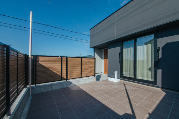 サンルームとウッドデッキ: 1階に2.0帖のサンルームを配置し、さらにウッドデッキへ直接繋がる動線を確保。室内でも外でもスムーズに洗濯物が干せます。