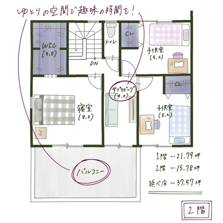 全室収納完備: 2階には5.2帖の子供部屋2室と、8.0帖の寝室を配置。寝室にはさらに3.0帖のWICを設け、夫婦の荷物もたっぷり収納可能です。
