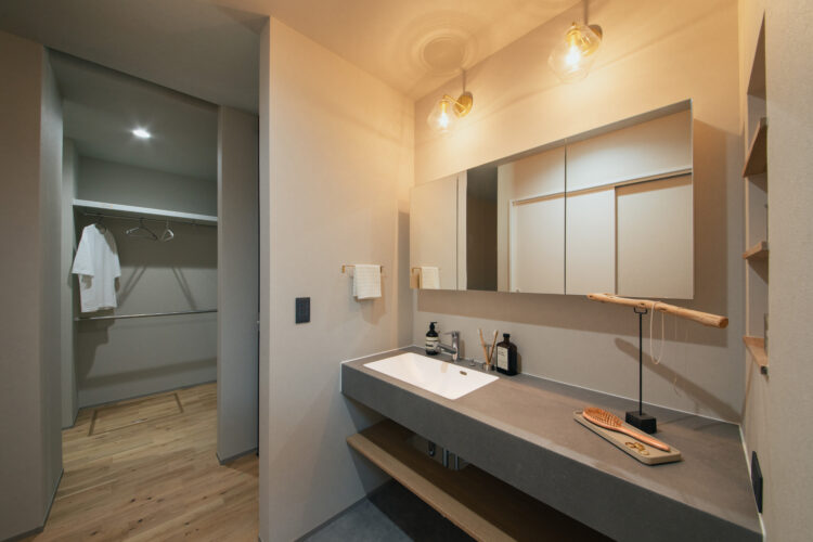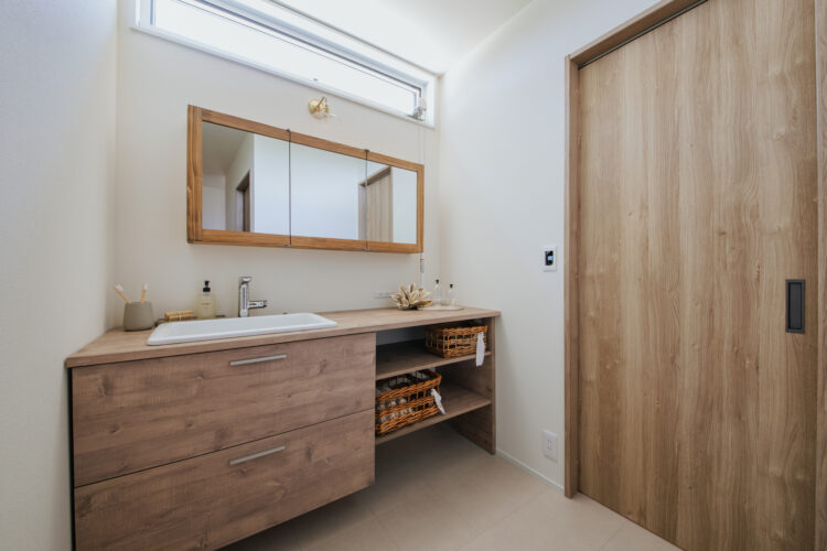 機能的な洗面室: 1階の洗面室(3.0帖)は広めに取られ、朝のメイクや身支度も落ち着いて行える設計になっています。