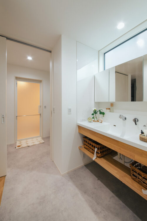 洗面室と脱衣室を分けた設計も見逃せません。家族が入浴中でも気兼ねなく洗面台が使えるほか、来客時にも安心。脱衣室にはパントリーも隣接しており、キッチンと水回りがコンパクトにまとまった便利な家事動線になっています。