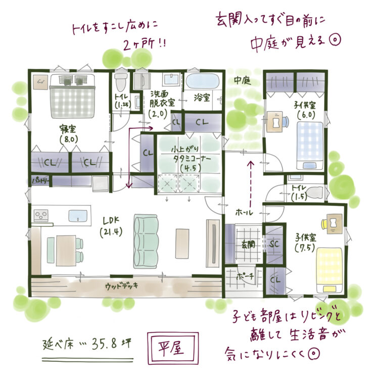 共働きの朝は1分1秒が勝負。このプランの最大の特徴は、トイレを少し広めに2ヶ所配置している点です。