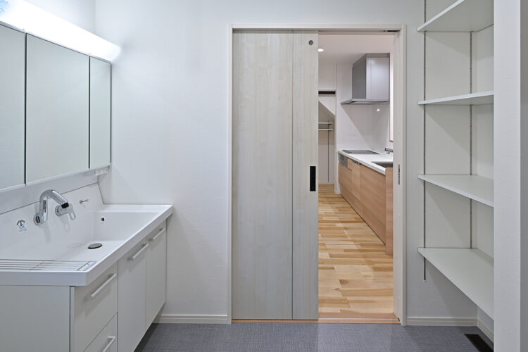 家族が重なる時間帯でもストレスがなく、将来的なバリアフリーも考慮された広さです。さらに、キッチン横のパントリーから洗面脱衣室(2.0帖)へ抜ける動線があるため、料理をしながら洗濯機を回す「家事の同時並行」がスムーズになります。