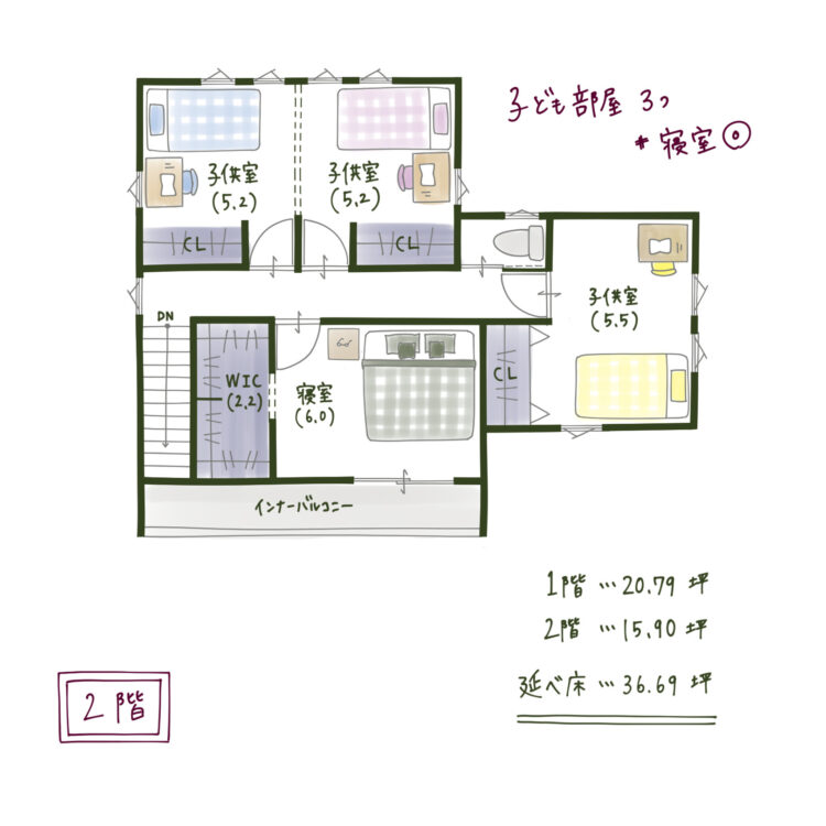 2階の整理術: 2階には主寝室に隣接するWIC(2.2帖)に加え、子供部屋3つを確保。ライフスタイルの変化に合わせて、いつでもお家をスッキリ保てます。