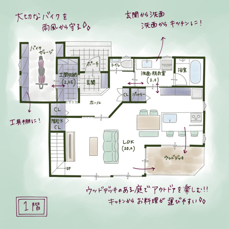 豊橋での注文住宅設計で意外と見落とされがちなのが、外で使うものの収納場所。このプランには、大切な相棒を雨風から守る「バイクガレージ」が組み込まれています。
