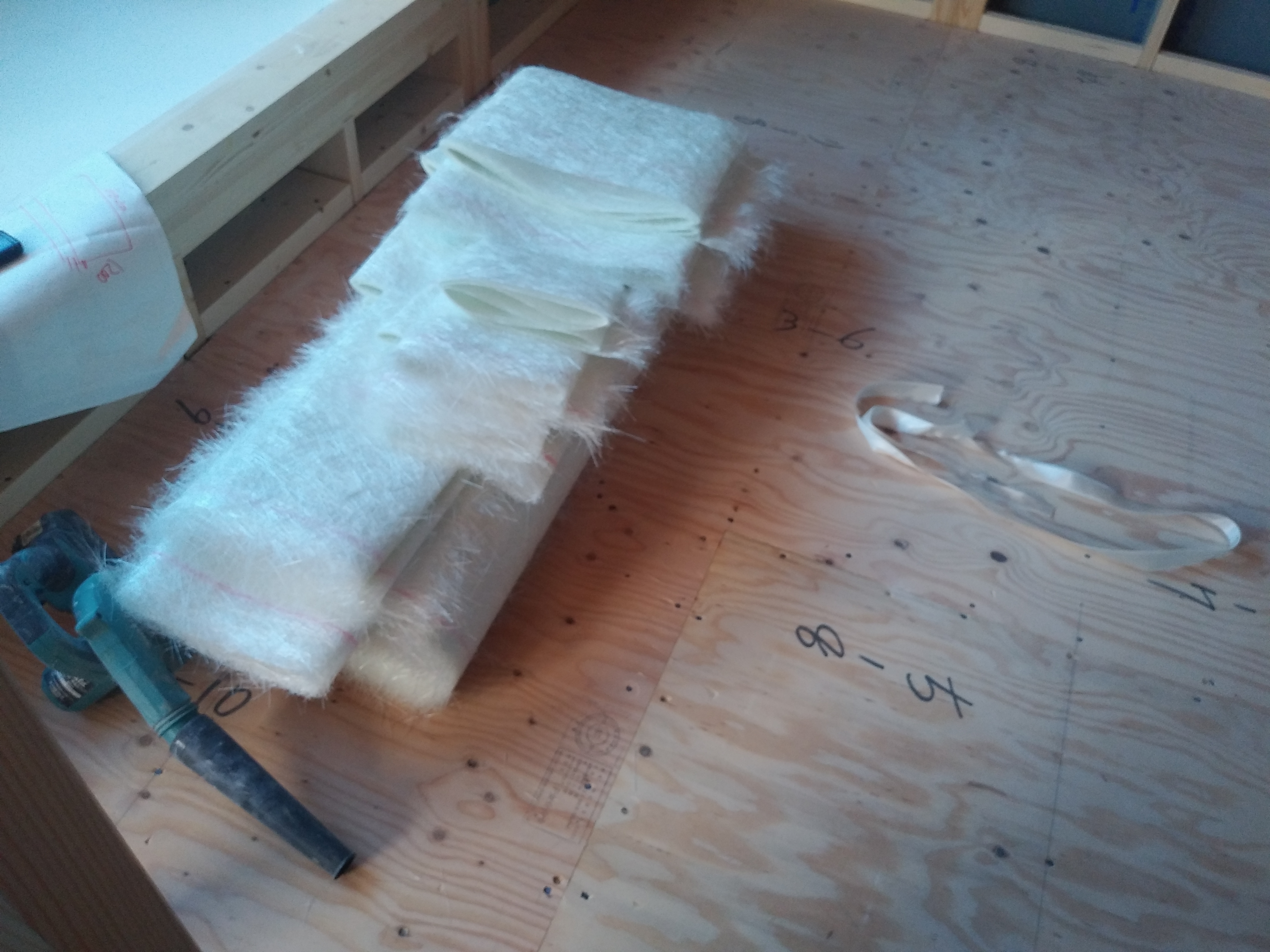 大工さんが作った下地の上にプライマーを塗布しポリエステル樹脂の上にこのガラスマットを敷きます。