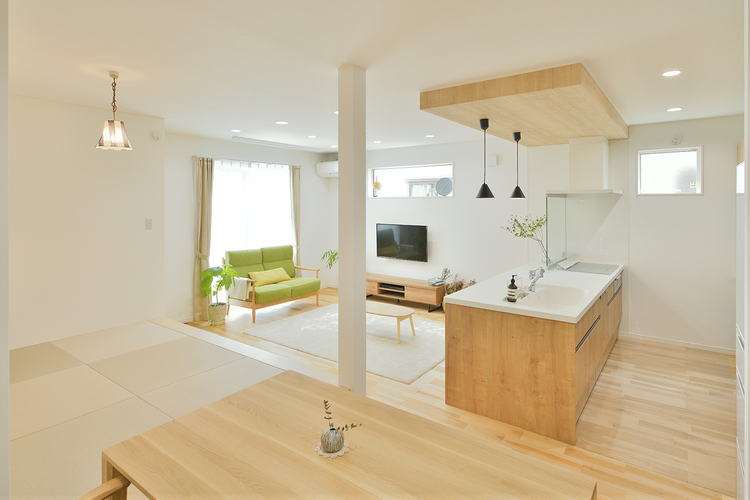 キッチンで作業をしながらリビング、タタミコーナー、ダイニングすべてを