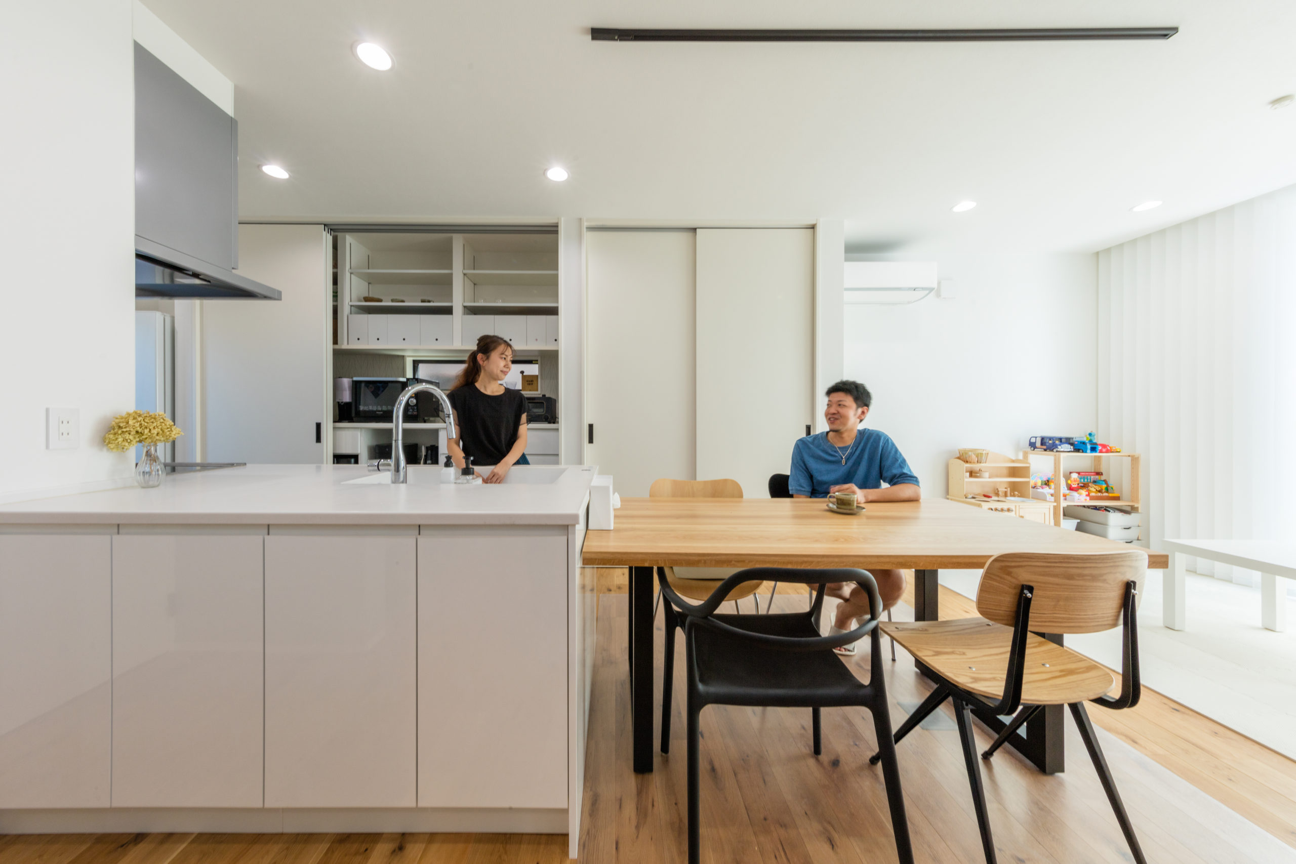 キッチン背面に収納扉を付けることで、カップボードをすべて収納できます。
