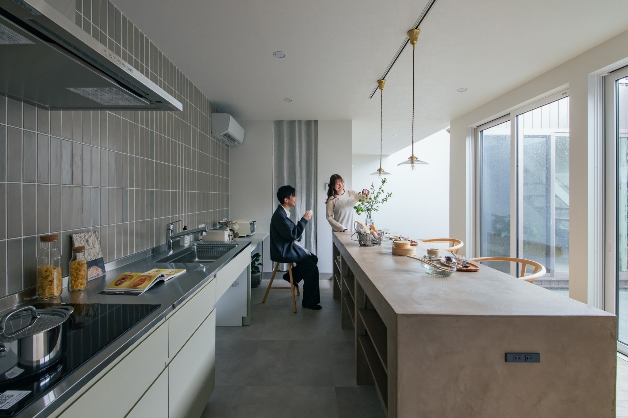 キッチンスペースは一段床高を下げることで、どこの場所にいても目線を合わせ会話を楽しむことができる。