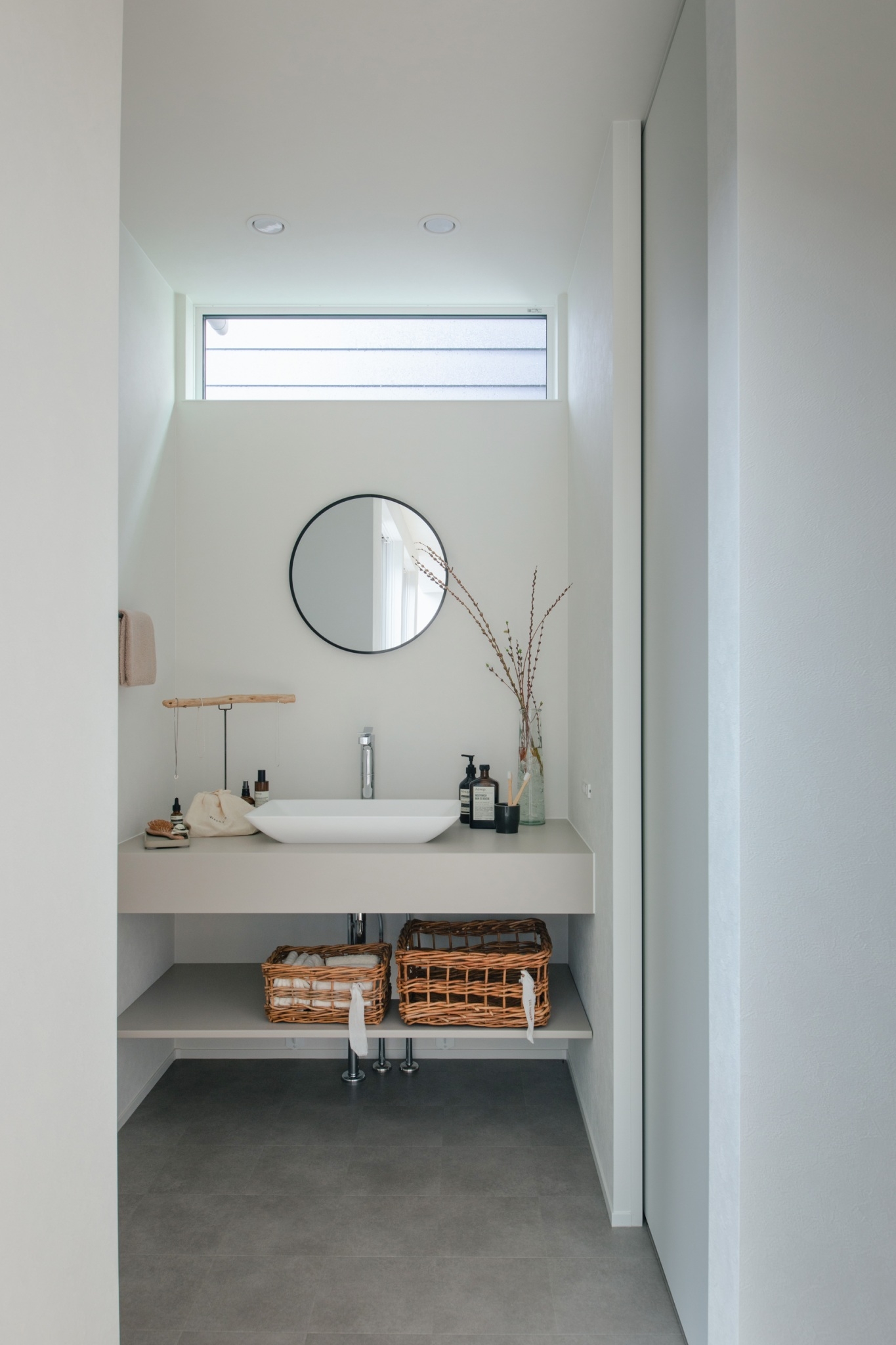グレーのクッションフロアとシンプルに色味を揃えたアイカ工業の洗面台。