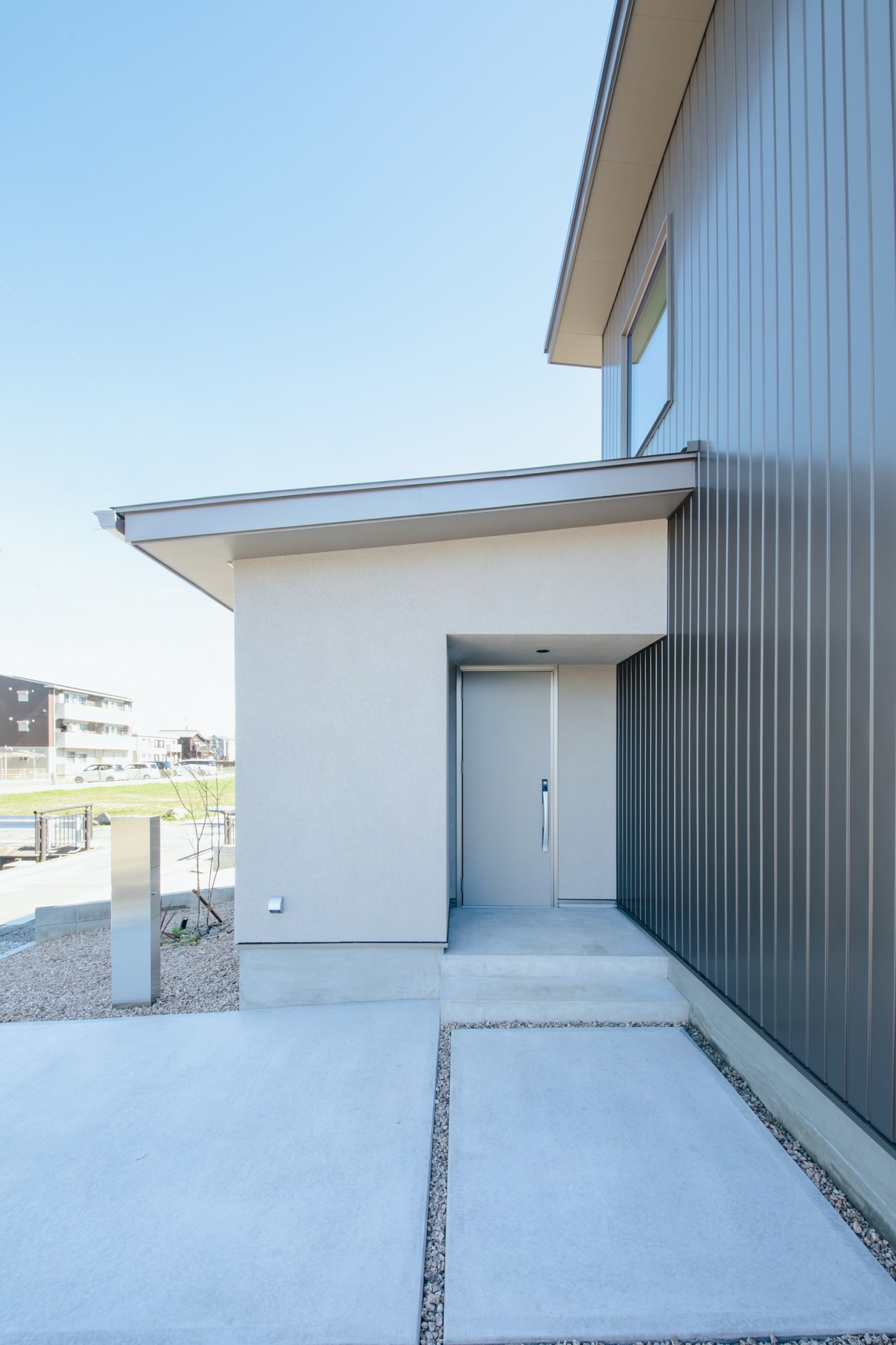 玄関周りは塗り壁を使用。