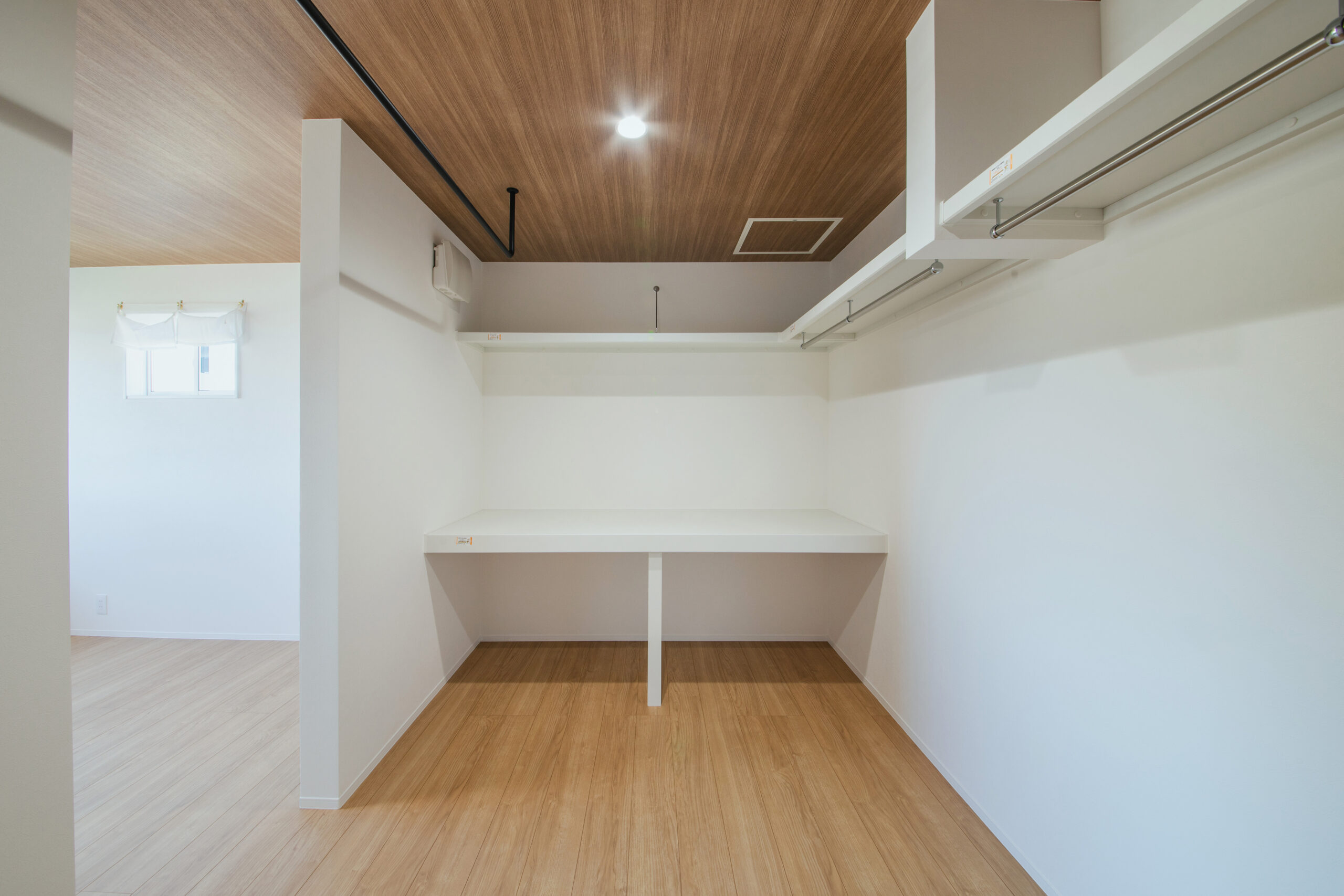 両側にハンガーパイプと棚を備え、衣類や小物をすっきり整理できるつくりに。