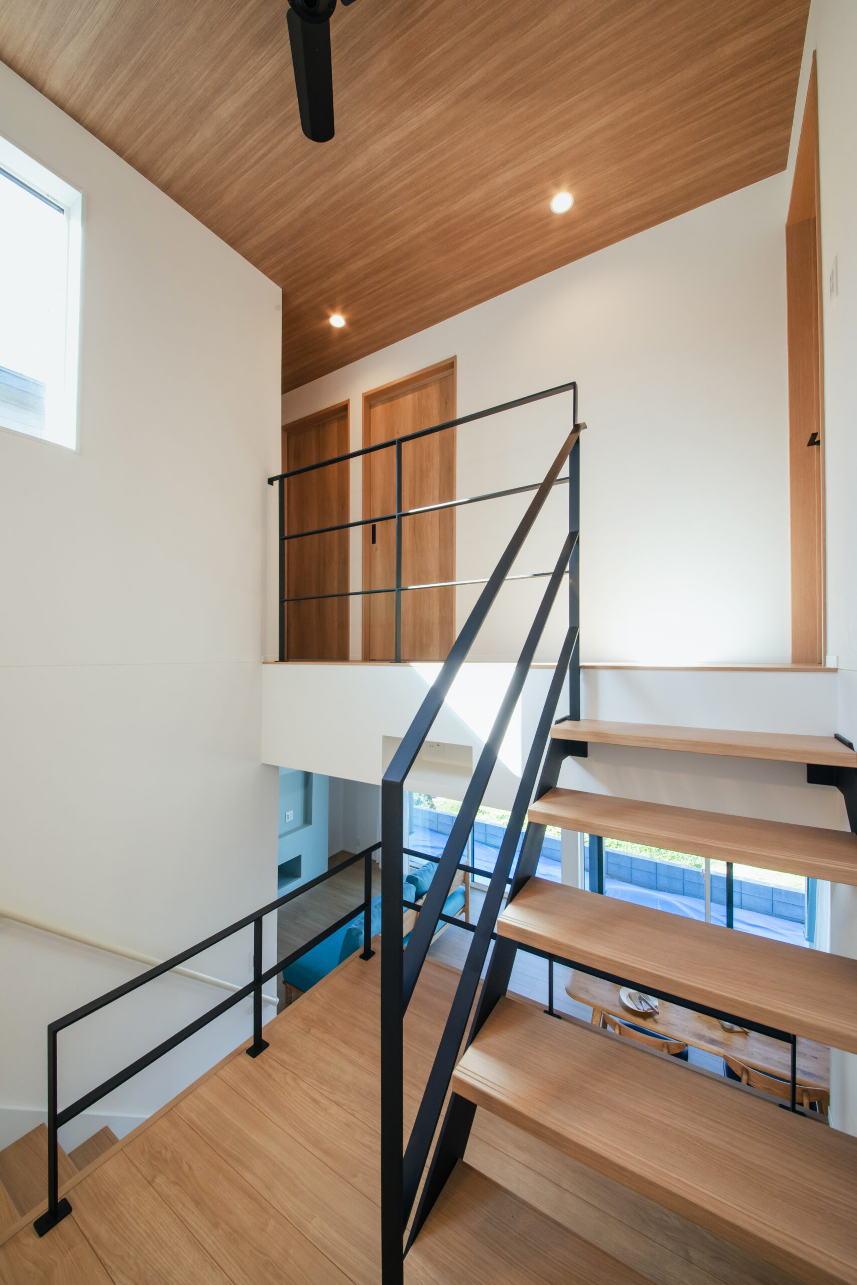 光を遮らないスリット階段とアイアン手すりが、空間に軽やかさとデザイン性を添えています。