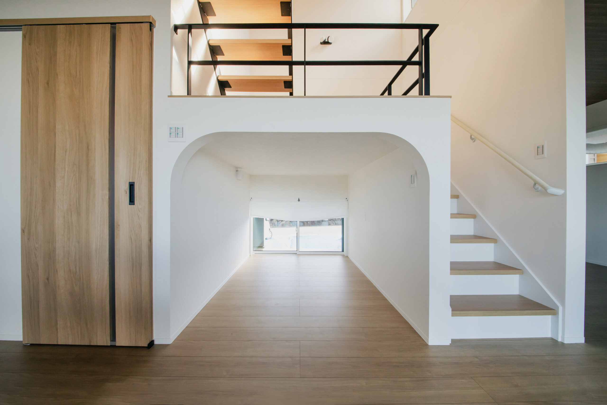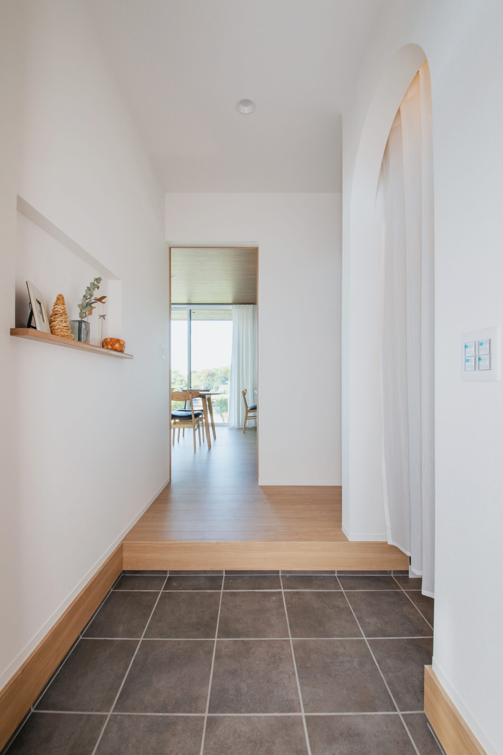 アーチの入り口とニッチの飾り棚が、シンプルな空間にやさしいアクセントを加えています。