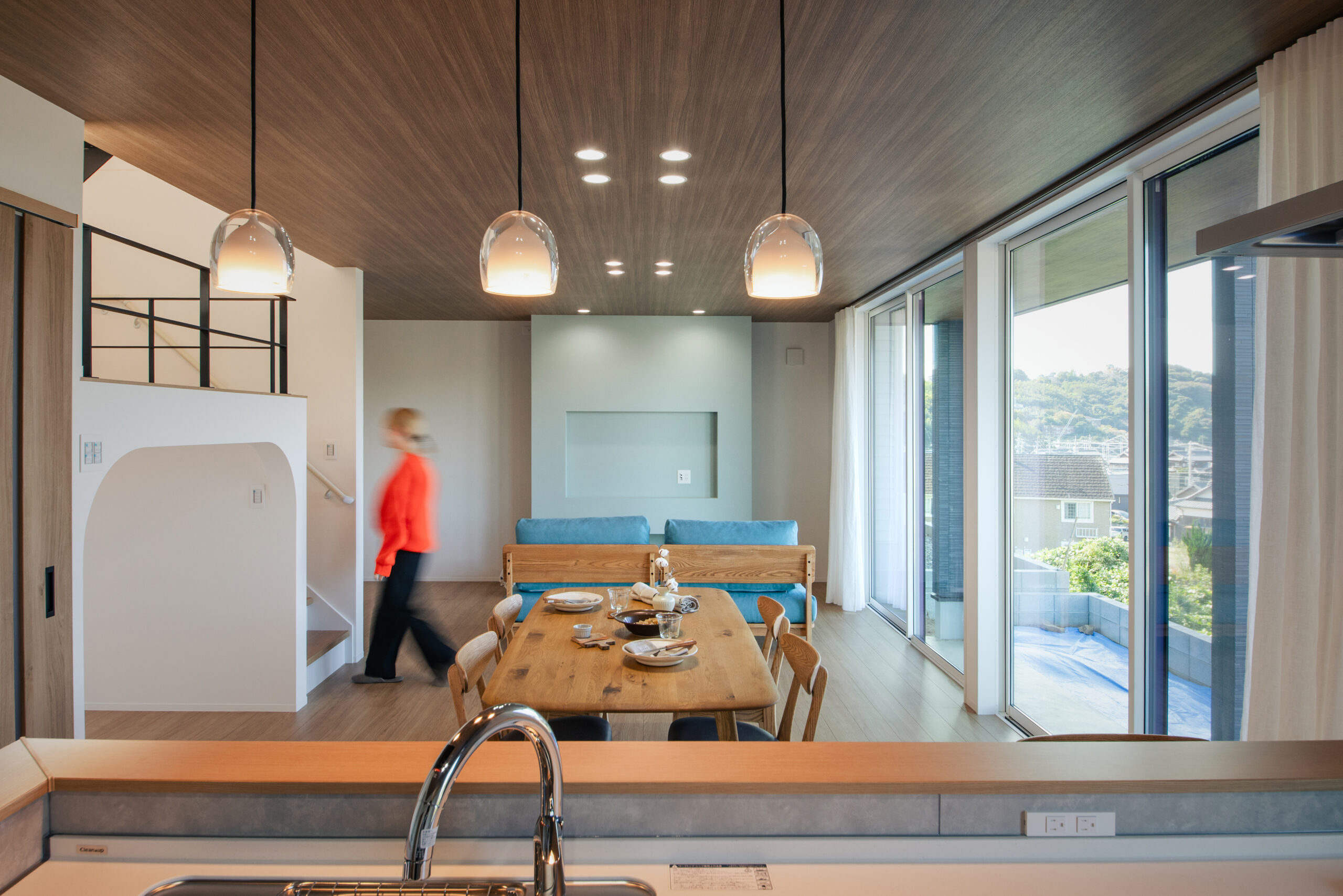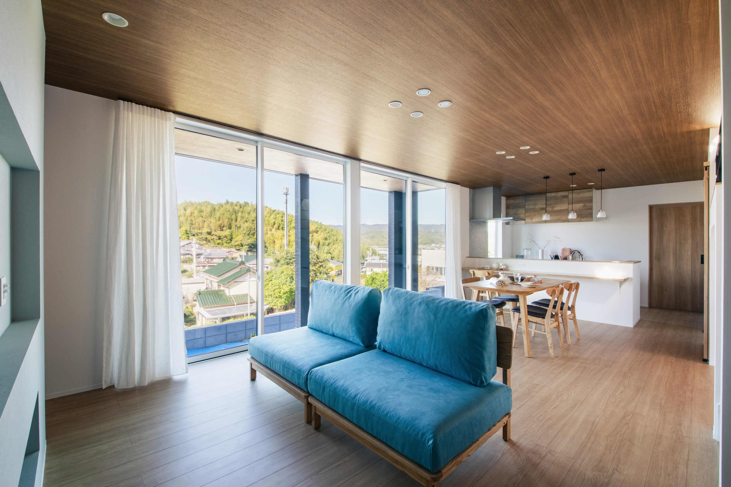 落ち着いた木目天井とソファーの優しいブルーのアクセントが、毎日の時間を心地よく彩る住まいです。
