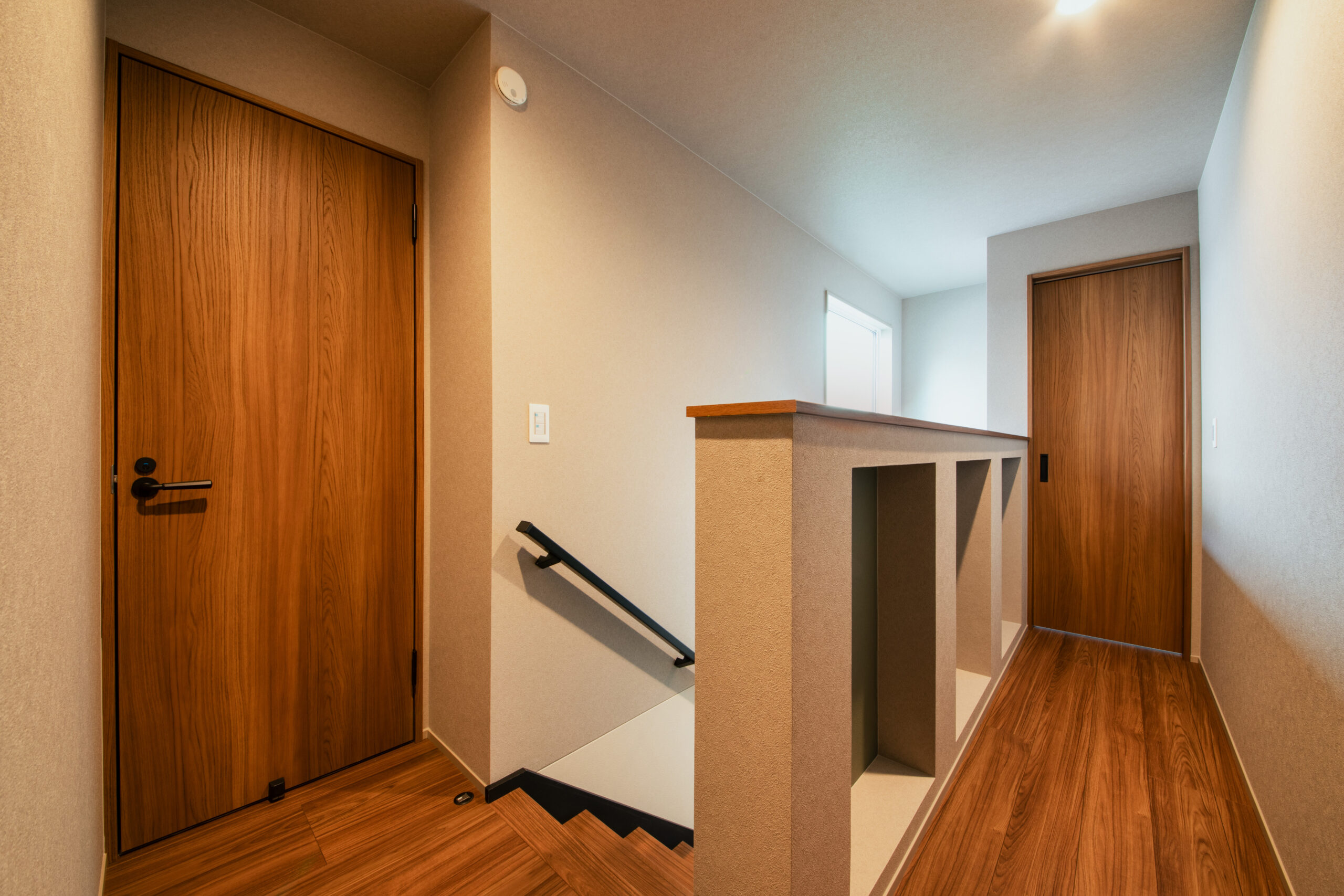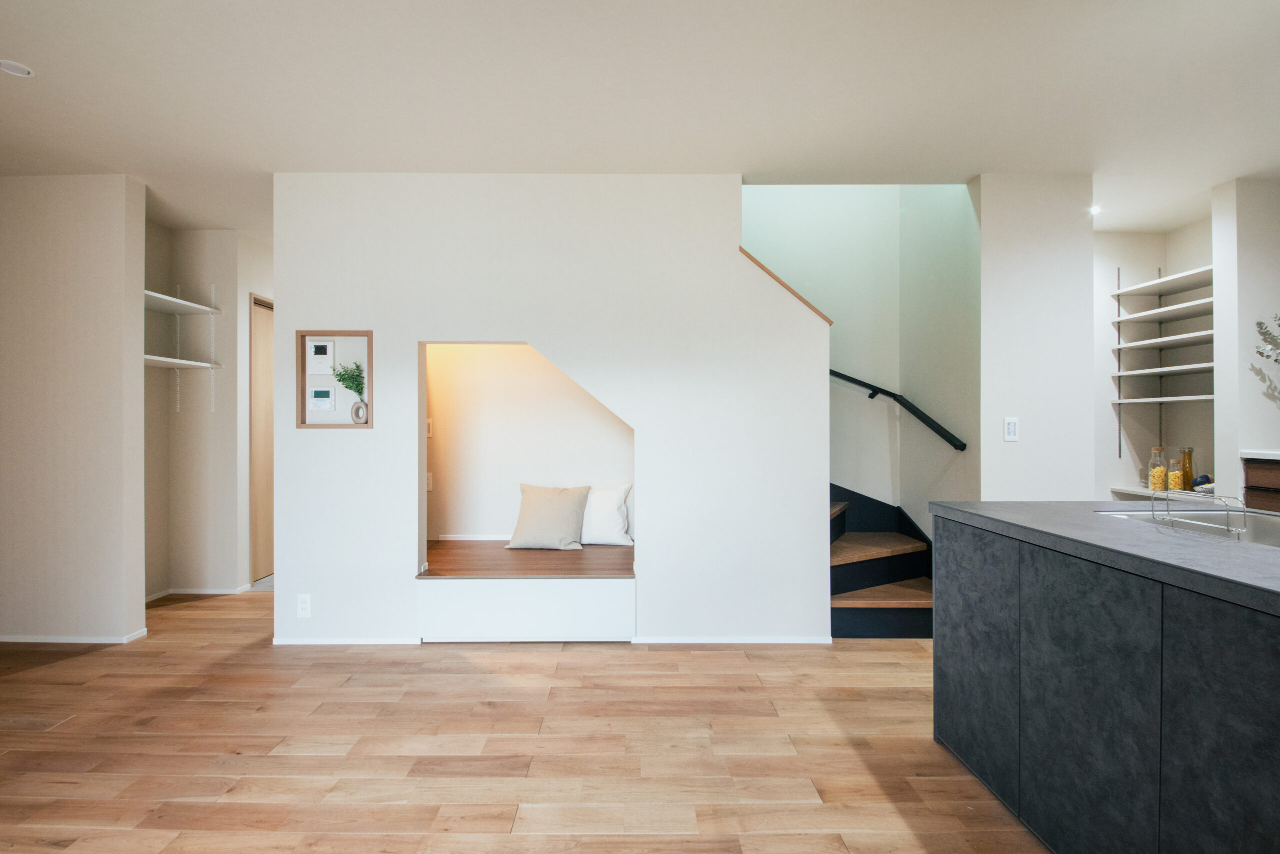 階段横には造作の収納を設け、移動の合間に自然と片付く、すっきりとした動線をつくりました。