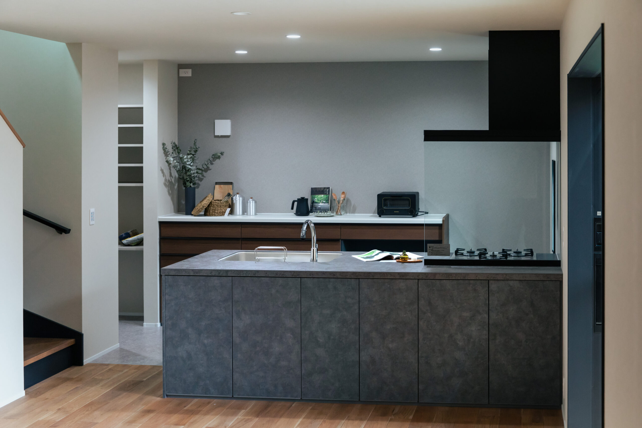 重厚感のあるグレートーンでまとめた、存在感のあるペニンシュラキッチン。