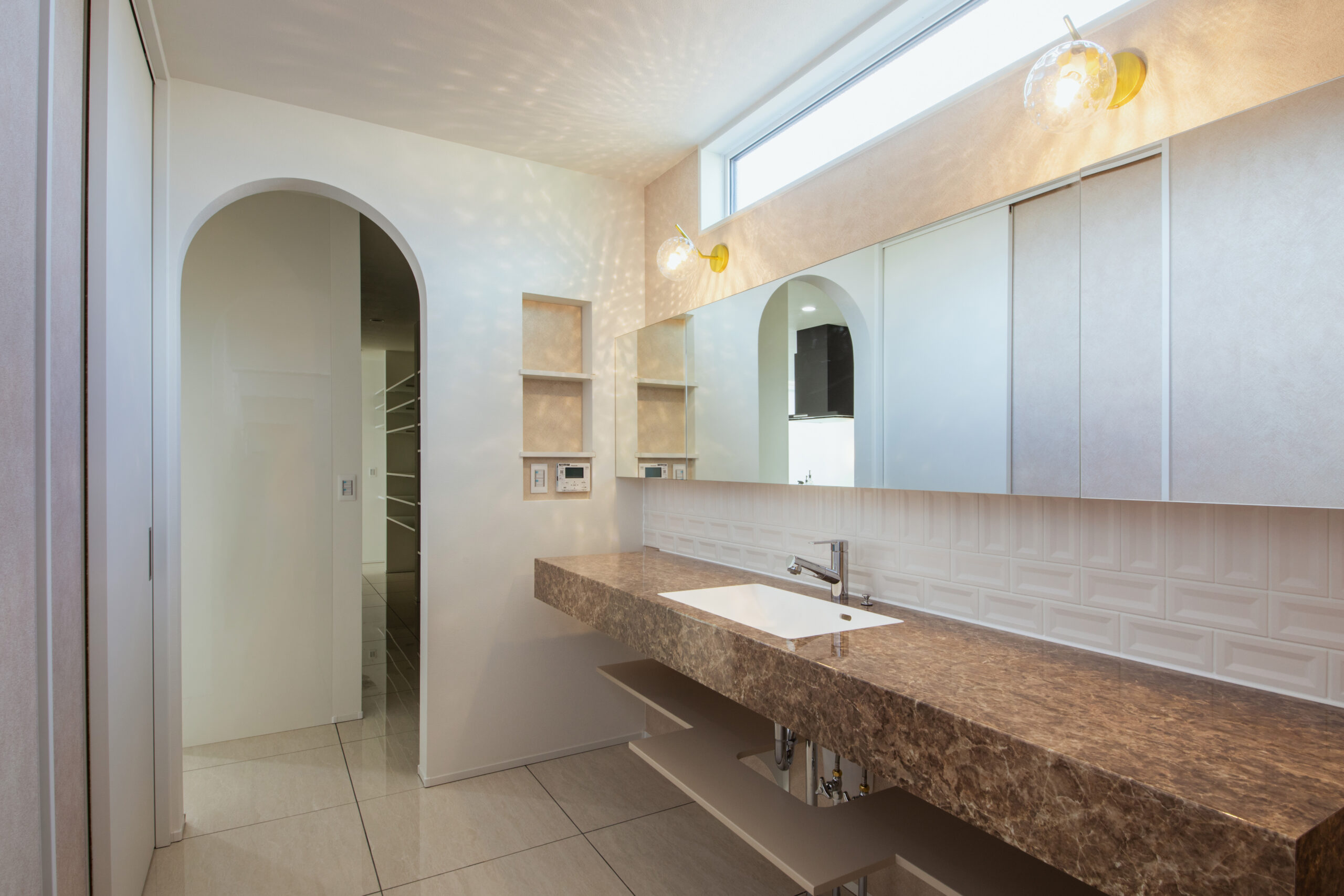洗面スペースはホテルライクな雰囲気を意識した造作カウンターを採用。石目調のカウンターと大きな鏡が上質でラグジュアリーな印象を演出、毎日の身支度も気分が上がる空間に仕上げました。