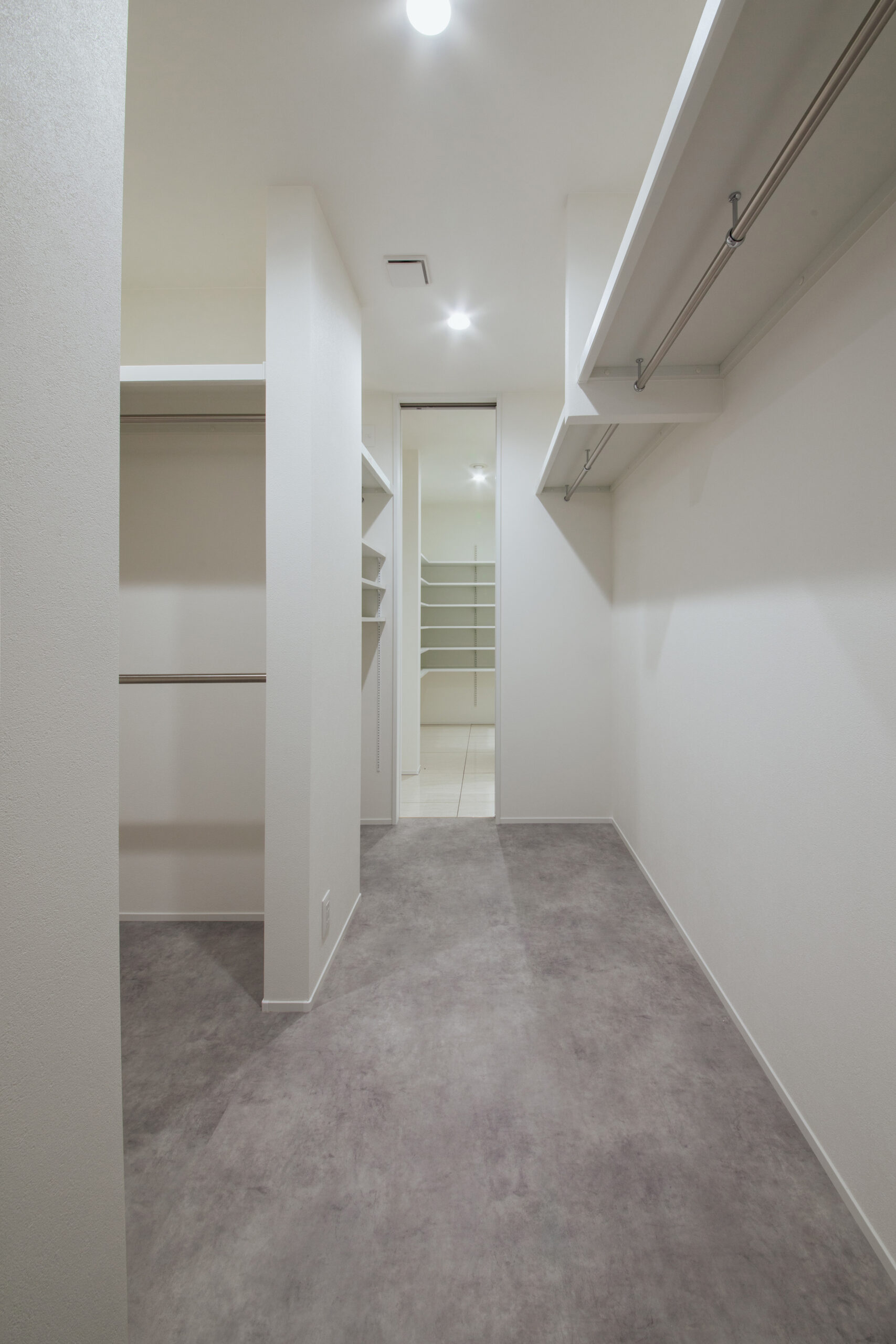 床は落ち着いたグレートーンで、衣類の色味も見やすく。毎日の身支度がスムーズになる、使い勝手の良いウォークインクローゼット。
