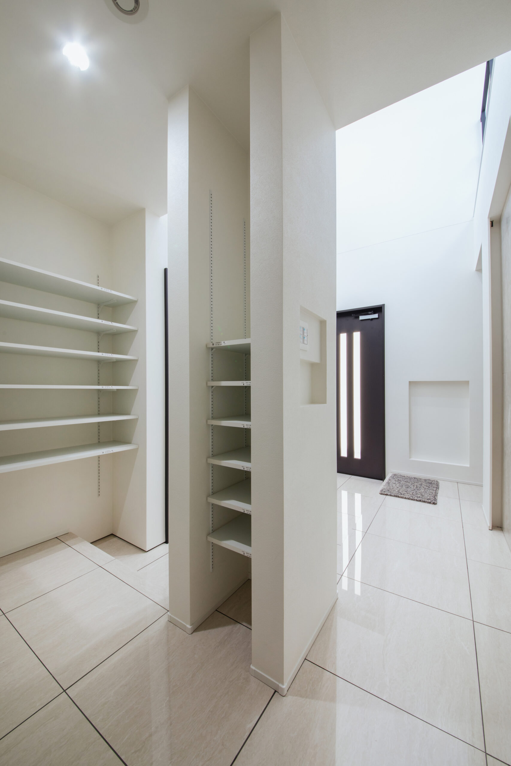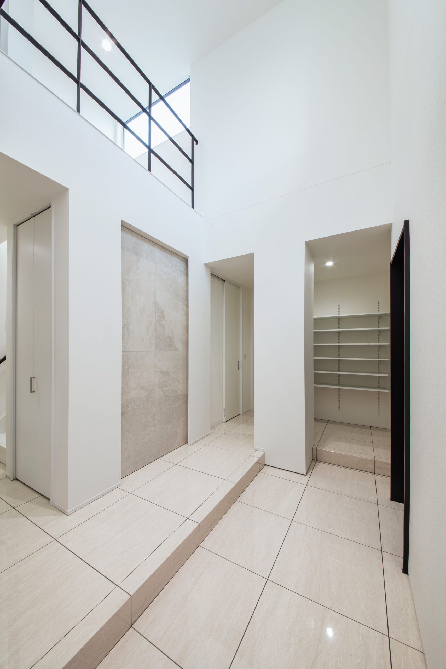 玄関ホールは吹き抜けと高窓から光が差し込む、明るく開放感のある空間に。正面の石目調のタイルニッチがより上質な空間を演出します。