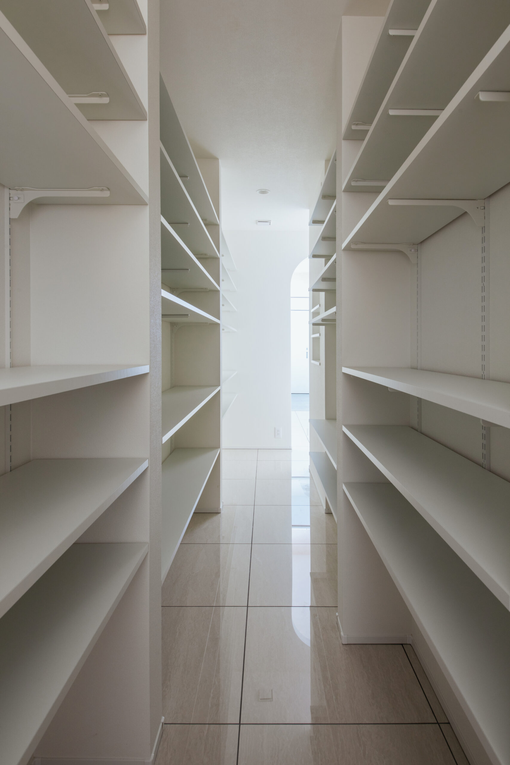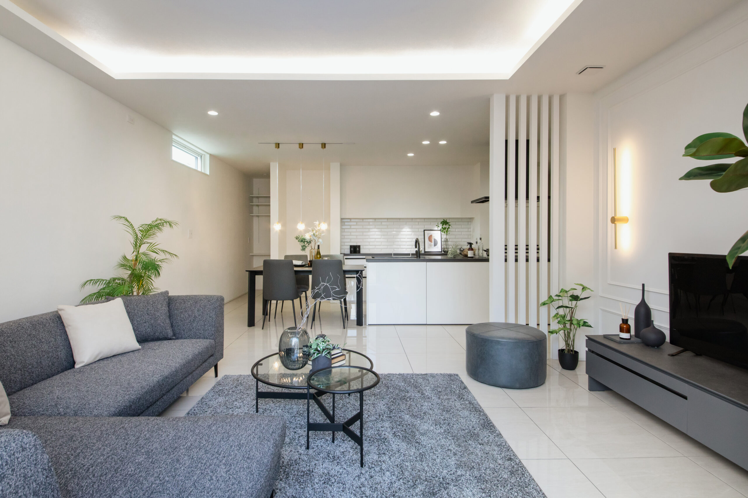 白を基調としたLDKは、ホテルライクでラグジュアリーな雰囲気に。間接照明を取り入れた折り上げ天井が空間に奥行きを生み、昼と夜で表情の変わる上質なリビングに仕上がりました。キッチン・ダイニングまで視線が抜ける開放的なレイアウトで、家族やゲストとの時間もゆったりと楽しめます。