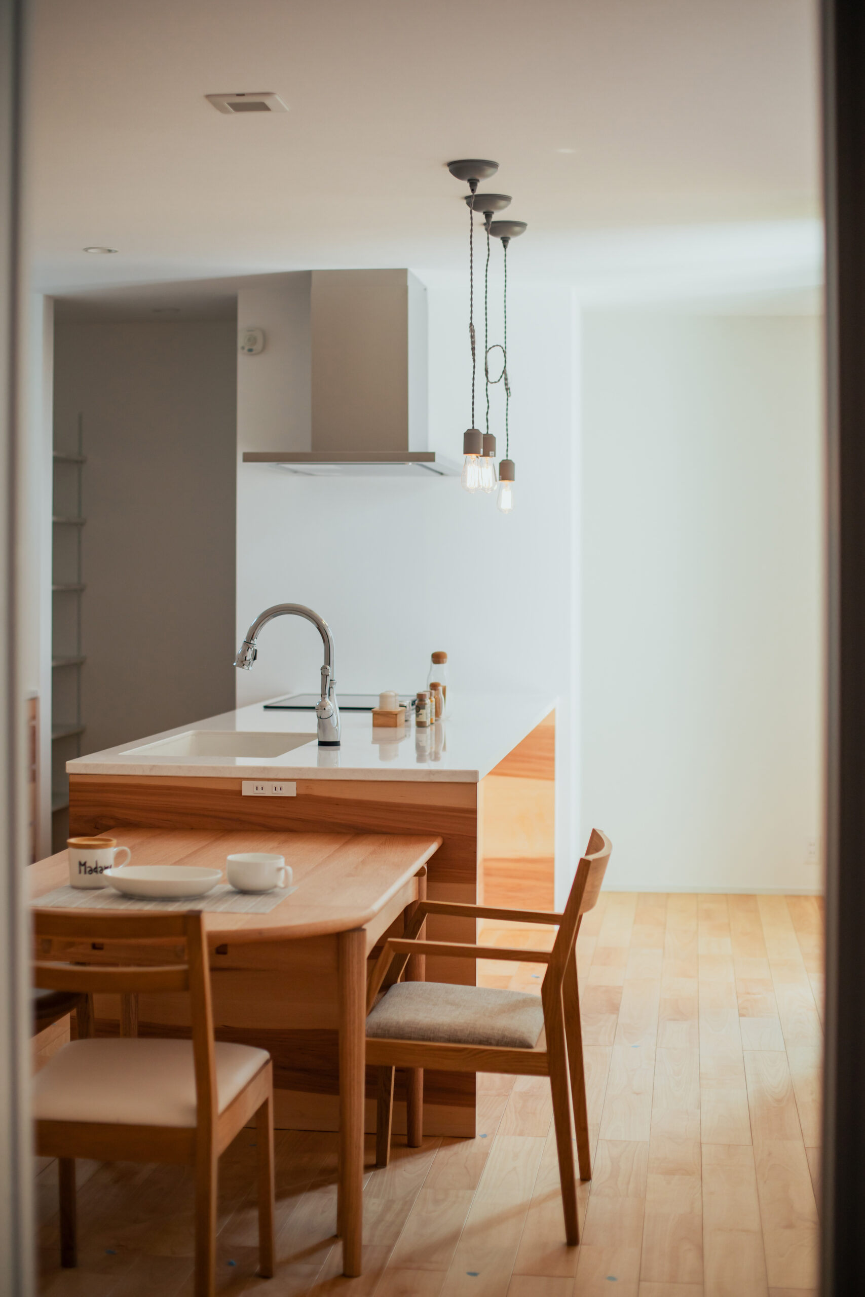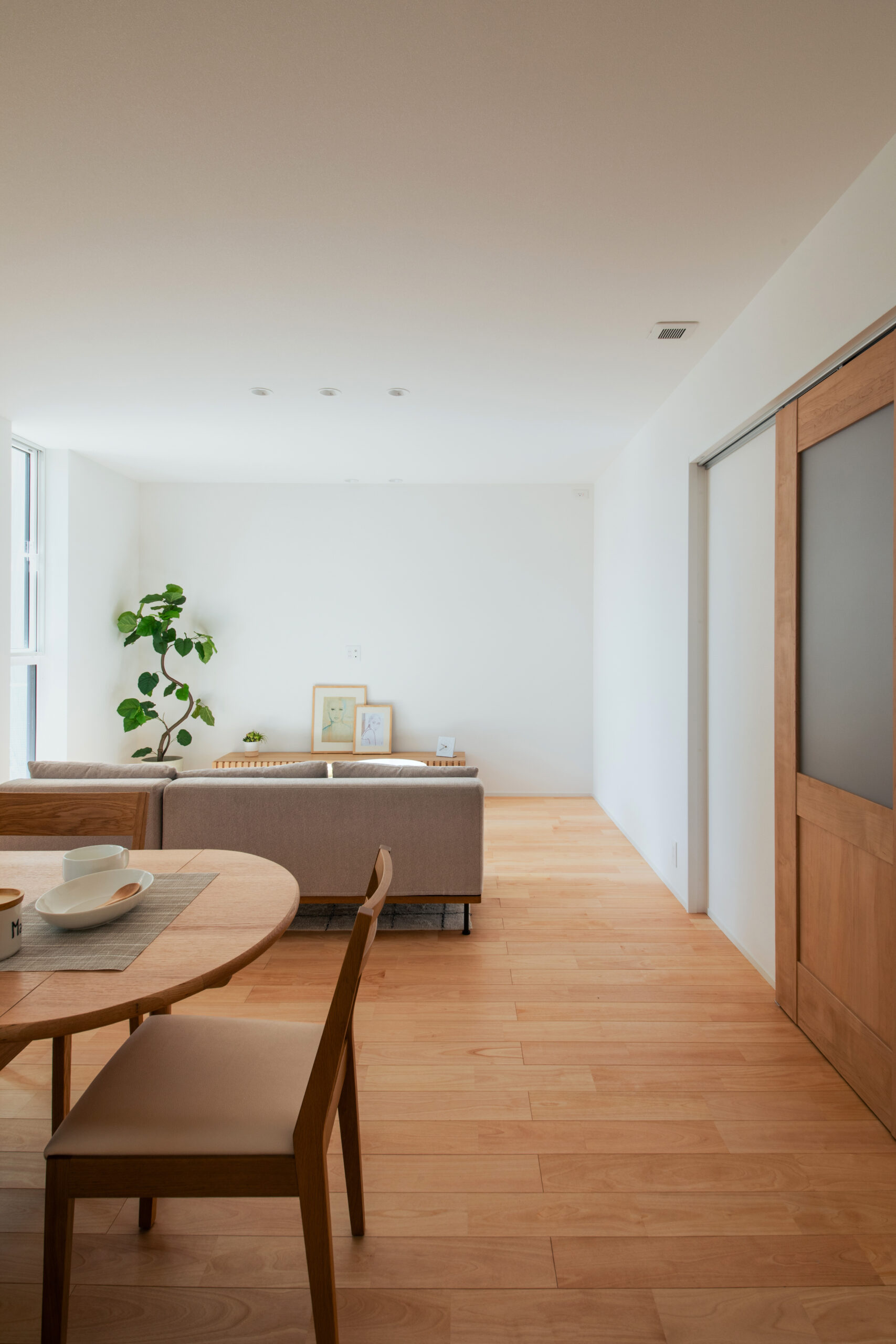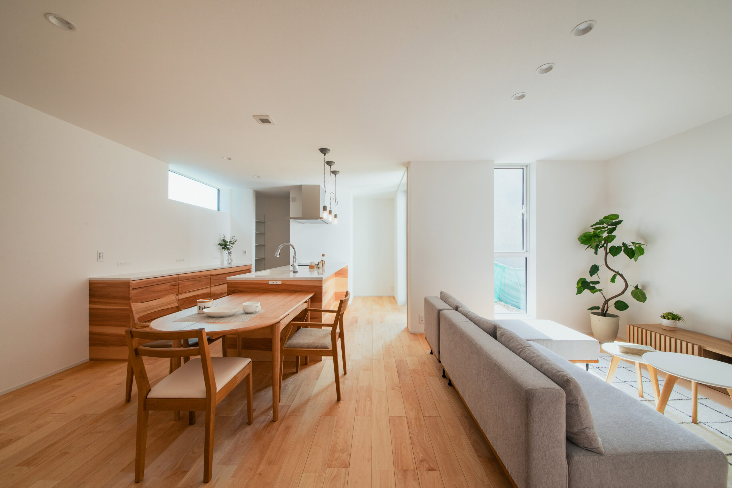 サクラのやさしい木目が空間全体に広がり、あたたかみのある心地よい雰囲気を演出しています。大きな窓から差し込む自然光が室内を明るく照らし、どこにいても家族の気配を感じられるのもポイント。日々の暮らしを無理なく、快適に過ごせる住まいに仕上がりました。