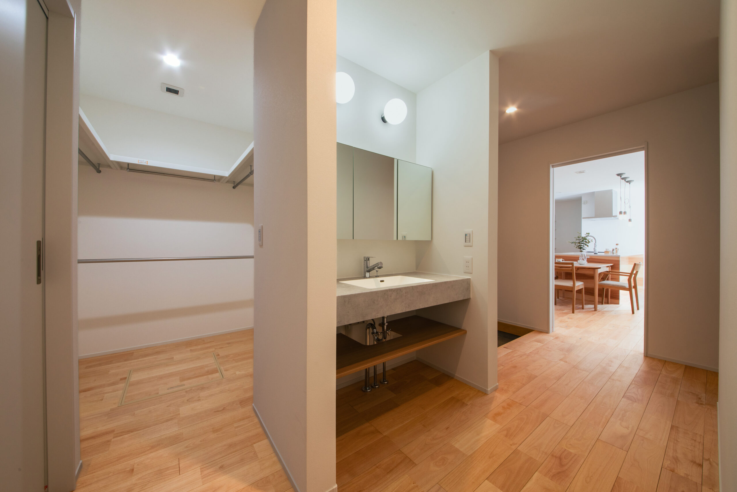 特にこだわったのが、脱衣室・ランドリー・ファミリークローゼットをつなげた家事動線。洗う・干す・しまうが同じ流れで完結することで、洗濯の負担を軽減し、自然と片付けやすい間取りを実現しました。